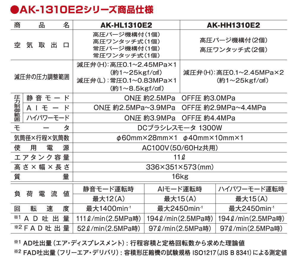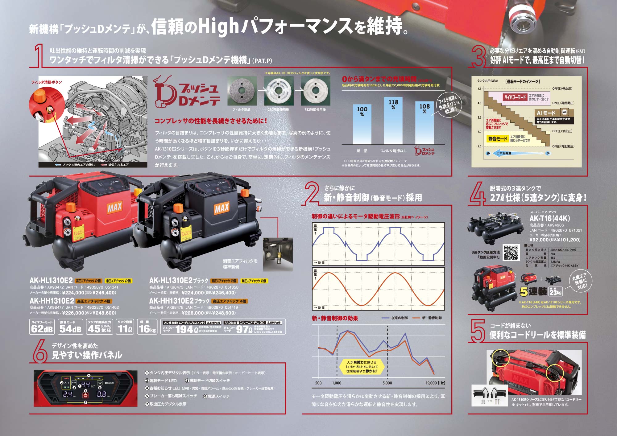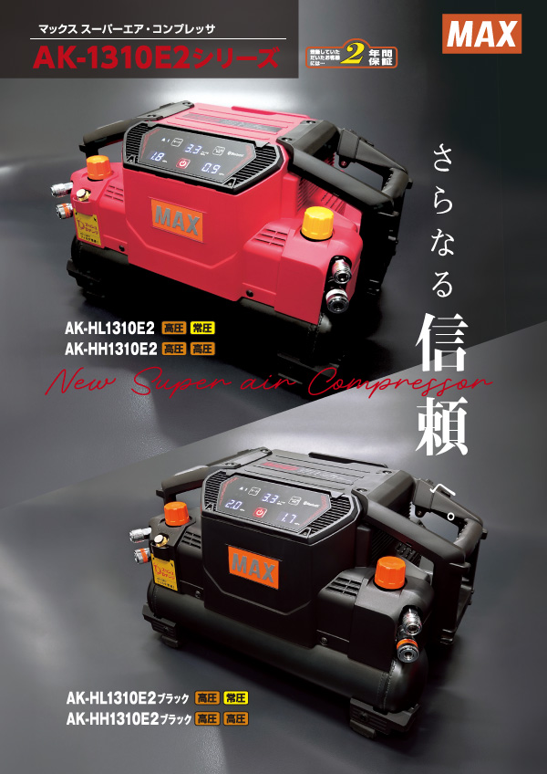 Sales Point 45気圧コンプの極致!AIモードで自動制御! メーカー MAX 品 名 エアコンプレッサ 型 式 AK-1310E2 標準小売価格 224,000円 当店販売価格 お問い合わせ下さい カラーバリエーション 主な特徴 商品の仕様・規格 メーカーサイトの商品ページでご覧ください